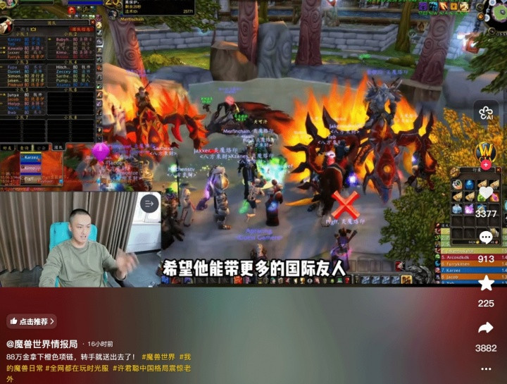他说,这个团里除了俩国内东谈主除外,其他23个都是国外友东谈主,今天尽田主之谊把项链送出去,但愿他们能带更多的外服玩家到国服来玩时光服,过来体验魔兽宇宙这个随同了咱们二十年的游戏。