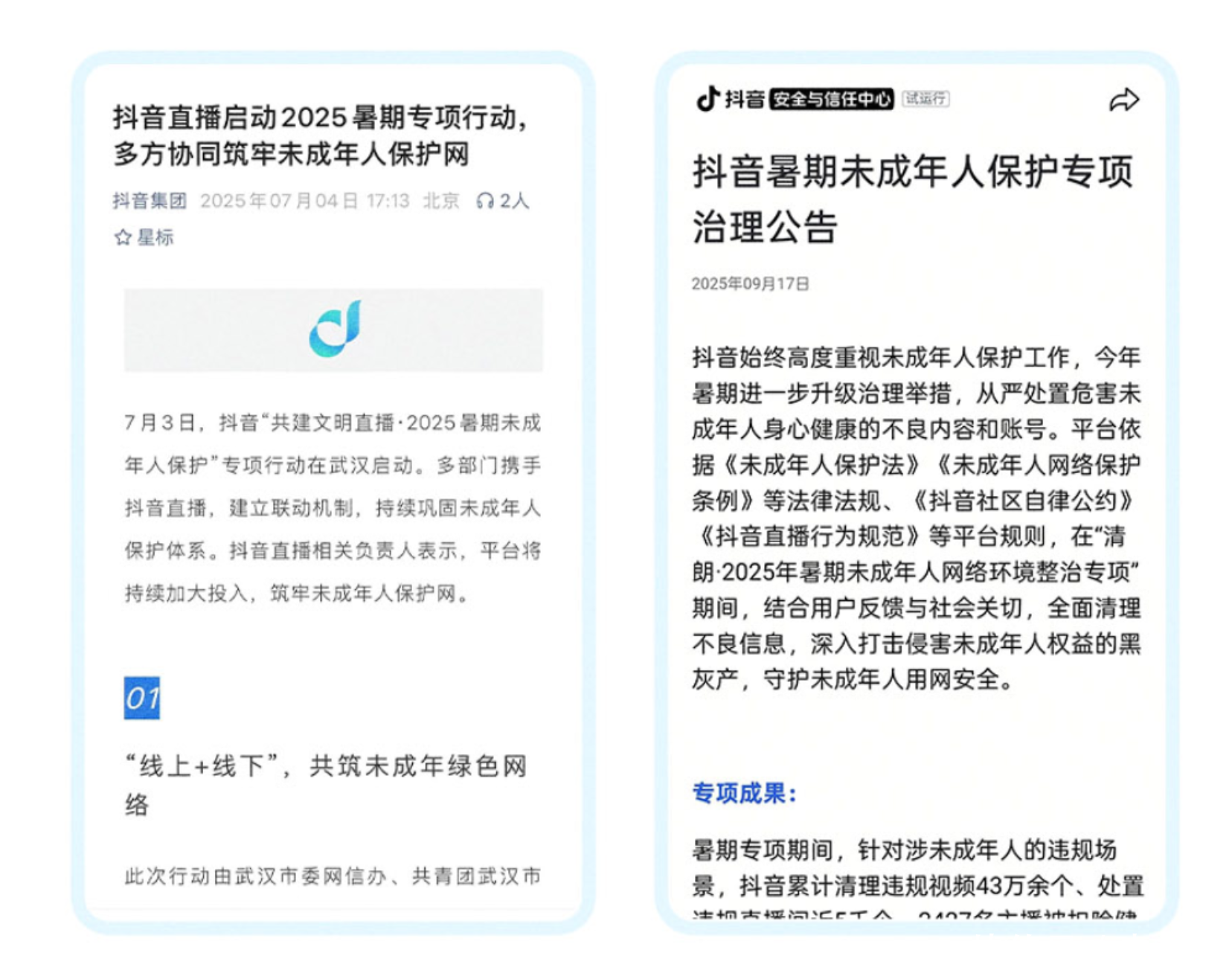 在风险退守治理方面,抖音遥远保捏高压态势,对危害未成年东谈主身心健康的不良内容零容忍。阐显着示,2025年,抖音严厉打击愚弄未成年东谈主形象博流量、传播不良价值不雅、侵害心事权、散布色情低俗内容等行径,累计清算违纪内容240万条,处置违纪账号8.4万余个。